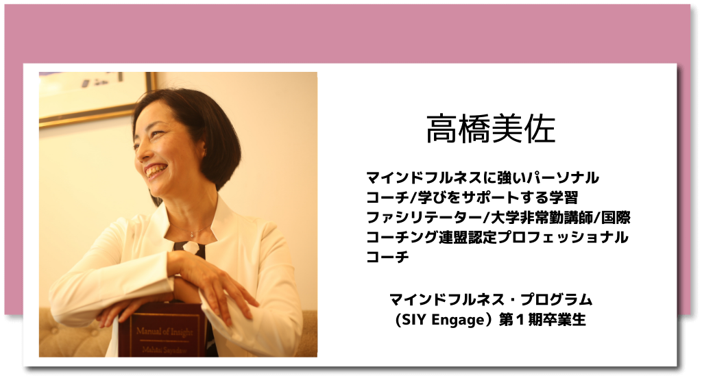 2013年、単独渡米でGoogle社で開発されたマインドフルネス・プログラムと出会う。2016年SIY Engageに参加し、世界18か国あまりの受講生と共に、第1期卒業生となる。マインドフルネスに出会い、それまで私が窮屈と感じていた「コーチングに対する疑問、物足りなさ、窮屈さ・・・」が解決解決され、コーチ・学習ファシリテータとしての活動に深みがましたと実感しています。